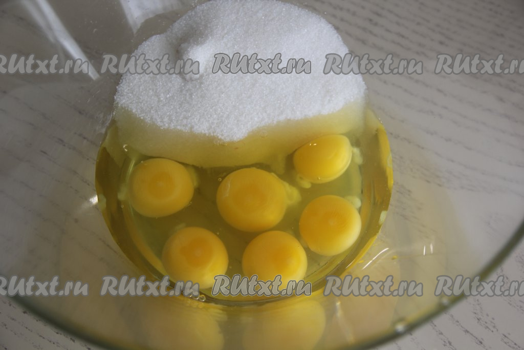 Яйца соединить в глубокой миске с сахаром.
