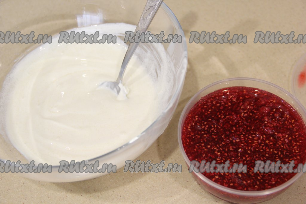Для приготовления крема соединить сметану и сахар, перемешать и отставить в сторону до полного растворения сахара. Подготовить ягодную прослойку (у меня малина, перетёртая с сахаром, но можно заменить на любое варенье, джем).