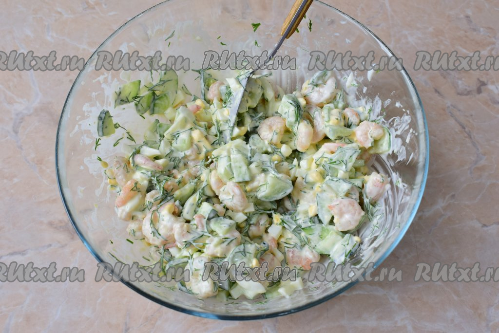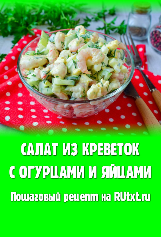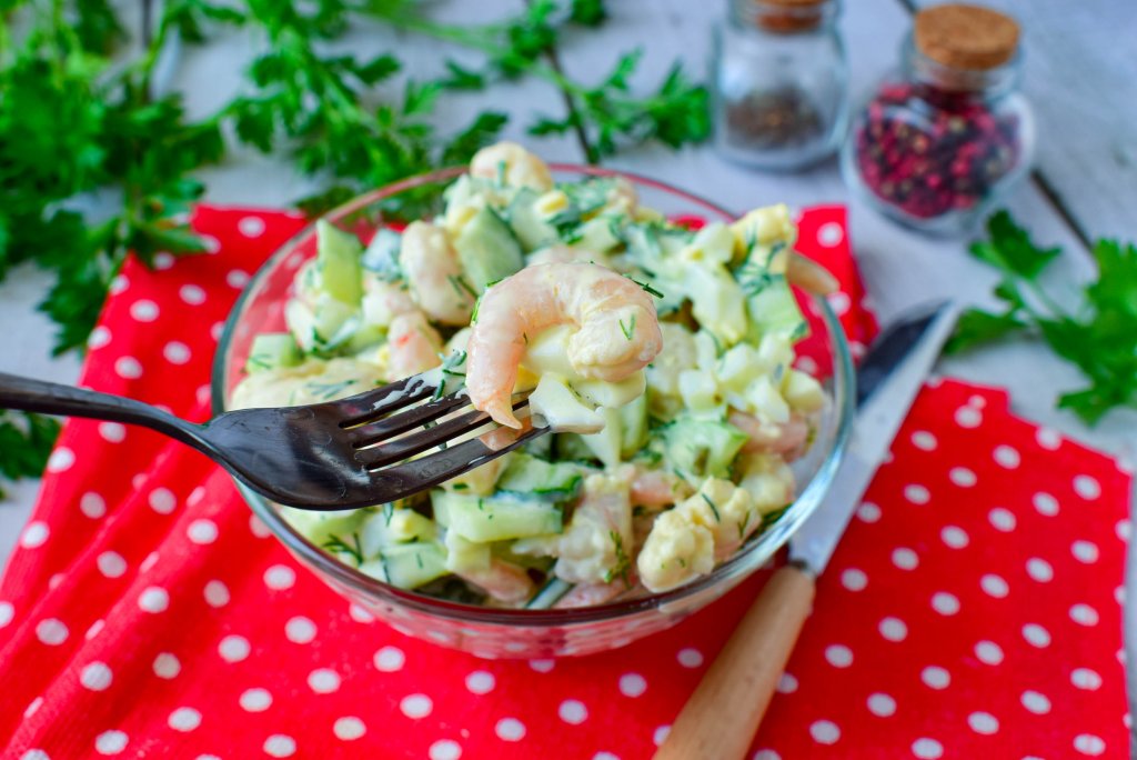 Вкусный, сочный, сытный салат, приготовленный из креветок с добавлением свежего огурца и варёных яиц, отлично впишется и в повседневное, и в праздничное меню, попробуйте!