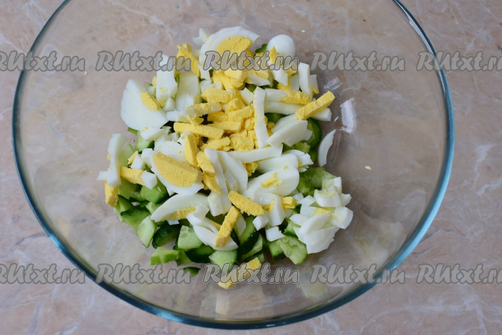 Нарежьте яйца на достаточно тонкие полоски и добавьте к огурцам.