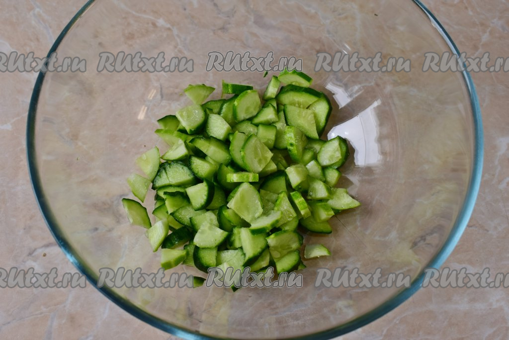 Огурец помойте, обсушите, разрежьте вдоль на 4 части, затем нарежьте тонкими ломтиками.