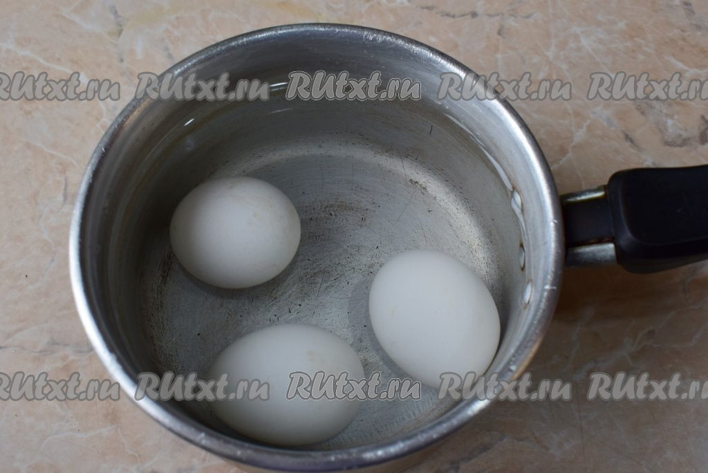 Для приготовления салата отварите яйца заранее в кипящей воде в течение 8-10 минут, затем остудите их, залив холодной водой, а после этого очистите.
