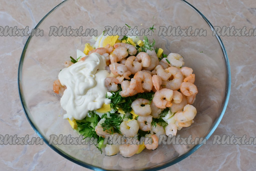 Креветки я использую салатные, уже в готовом виде. Если у вас креветки в панцире, то сначала их следует отварить: вскипятите воду, посолите её по вкусу выложите замороженные креветки, варите 1,5-2 минуты с момента закипания. Затем откиньте креветки на дуршлаг, ополосните холодной водой и очистите от панциря, освободив мясо, дайте полностью остыть. Для салата нам понадобится 150 грамм очищенных креветок. Добавьте креветки и мелко нарезанный укроп в салат из свежих огурчиков и яиц, заправьте майонезом, если нужно, подсолите, хорошо перемешайте.