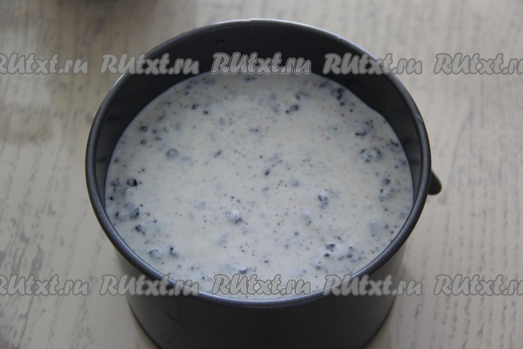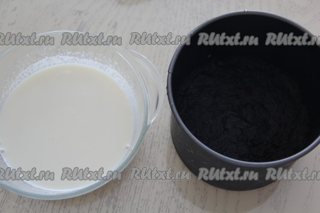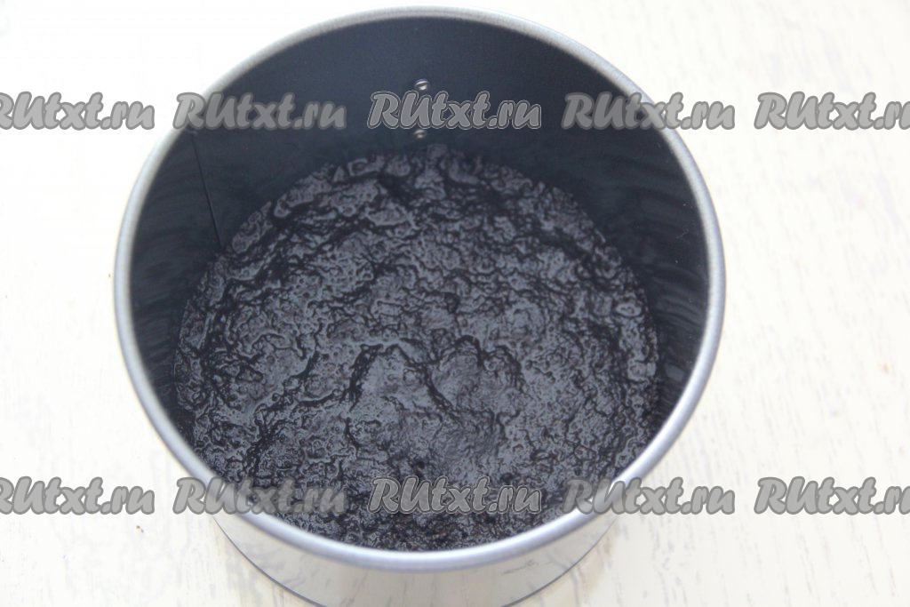 Выложить получившуюся основу в разъёмную форму (у меня форма диаметром 18 см) и плотно утрамбовать. Поставить форму с основой в холодильник на 1 час.