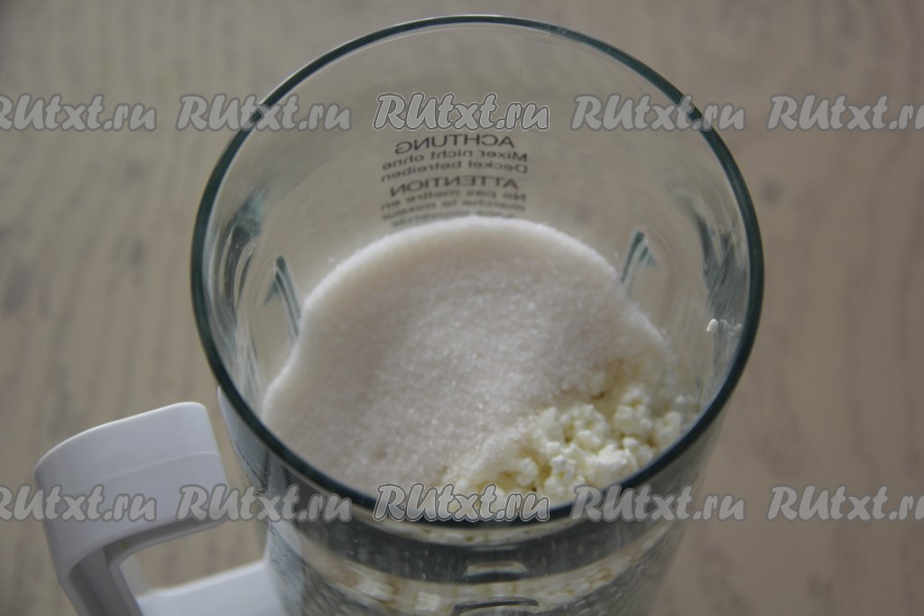 Для приготовления начинки нужно желатин замочить в холодном молоке на 15 минут. В чашу блендера поместить творог и сахар, пробить творожную массу погружным блендером до однородного состояния.
