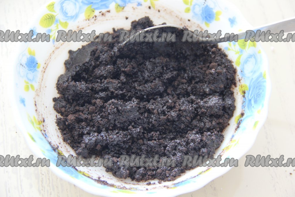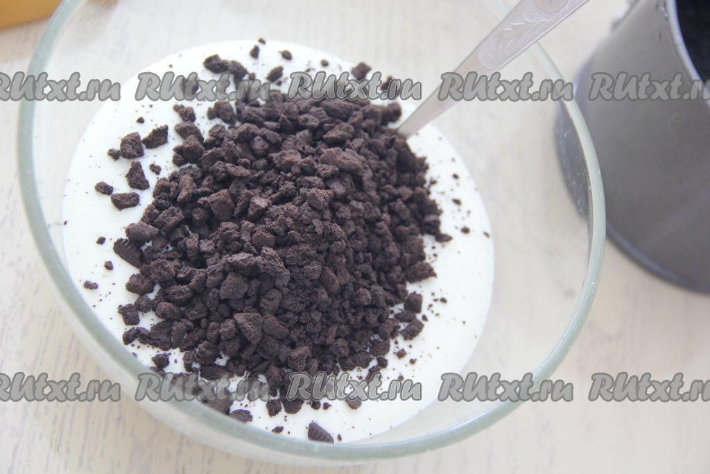 Отдельно 100 грамм печенья "Орео" измельчить в крупную крошку сначала руками, а затем - ножом. Добавить крошку в творожно-желатиновую смесь и аккуратно перемешать.