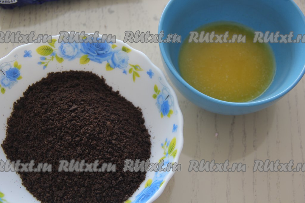 Вначале приготовим основу чизкейка, для этого печенье "Орео" нужно поместить в измельчитель и измельчить в крошку (если нет измельчителя, поместите печенье в целлофановый пакет и измельчите с помощью скалки). Сливочное масло растопить до жидкого состояния, немного остудить.