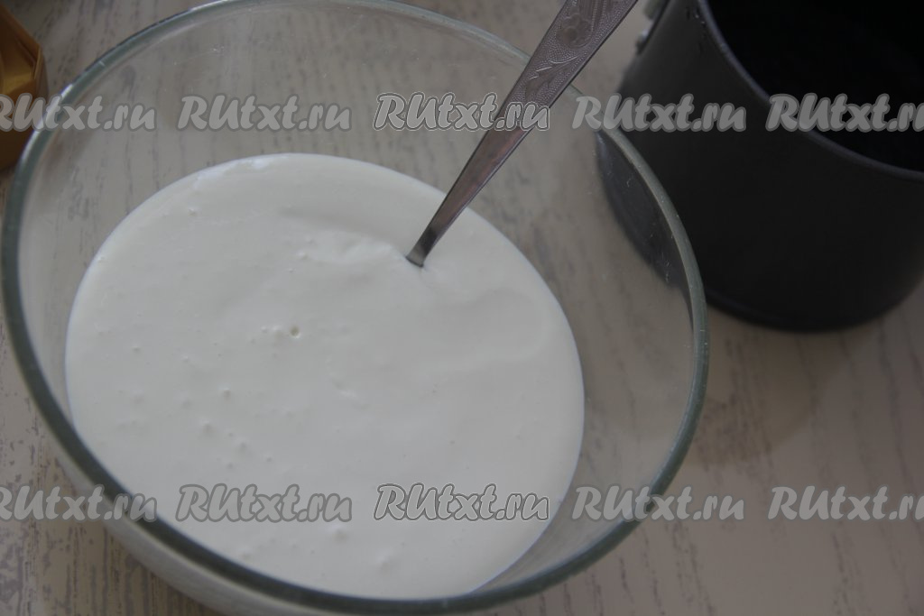 Добавить молочно-желатиновую смесь в творожную массу и взбить погружным блендером до однородности, перелить получившуюся творожно-желатиновую смесь в миску.