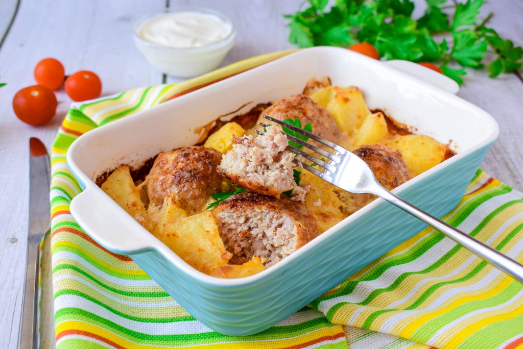 Картошка получается аппетитной снаружи и мягкой внутри, а мясные шарики достаточно сочными. Готовится блюдо просто, а получается и вкусным, и сытным, попробуйте!