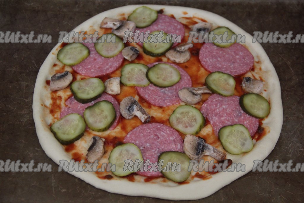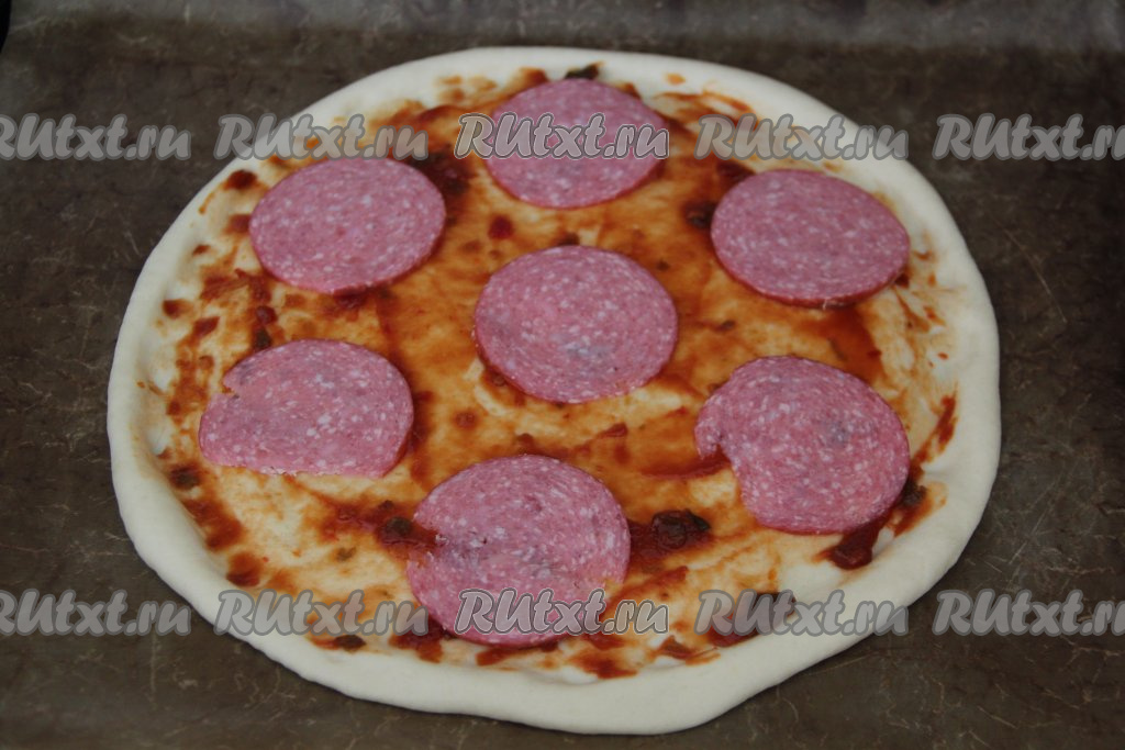 Смазать основу пиццы 2 столовыми ложками томатного соуса (или кетчупа) и выложить тонкие ломтики колбасы. Учитывайте, что количество начинки, указанной в ингредиентах, рассчитано на 2 пиццы.