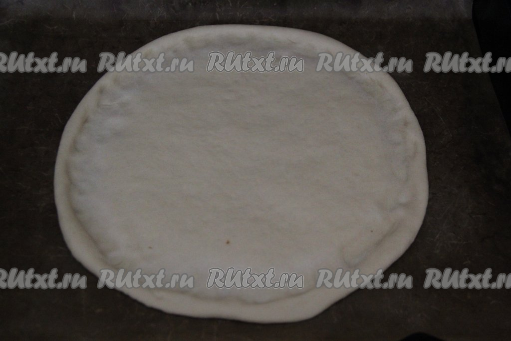 Разделить тесто на 2 части. Мы будем готовить 2 пиццы. Раскатать вначале одну часть теста скалкой в круг диаметром 30 см, переложить на противень, застеленный пергаментом. Сформировать руками на раскатанном тесте небольшой бортик, характерный для пиццы. Оставить основу для пиццы на 15 минут на противне.