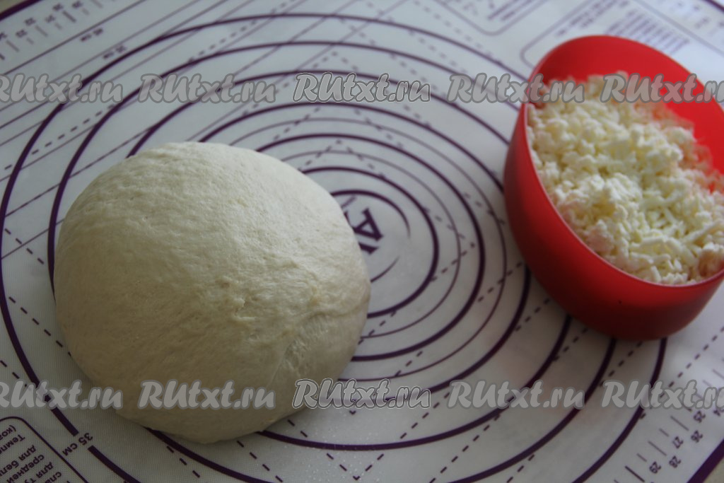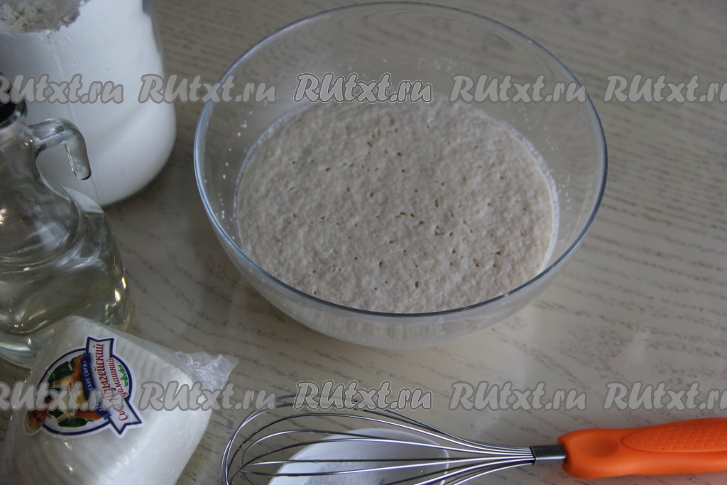 В активировавшуюся дрожжевую смесь всыпать соль и муку, добавить растительное масло. Замесить нежное и эластичное тесто. Вымешивать тесто минут 10. Затем оставить тесто в миске, накрыв пищевой плёнкой, минут на 45 в тёплом месте.