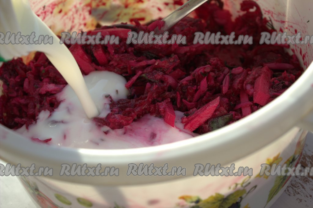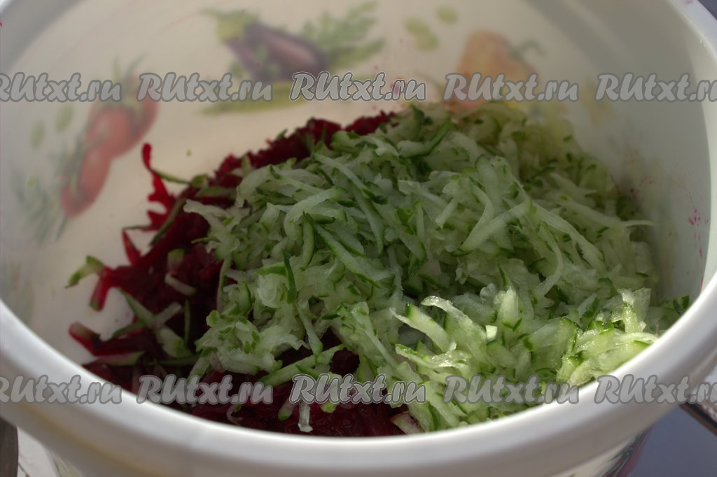 В миске соединить натёртую свеклу и натёртые на средней тёрке огурцы.