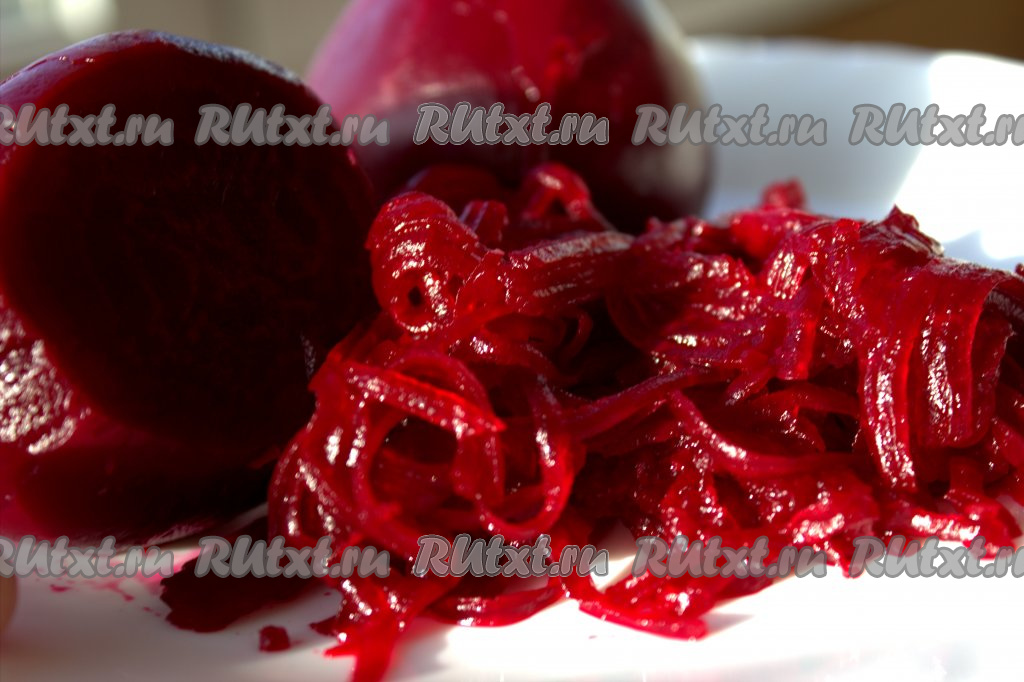 Свеклу хорошо вымыть, поместить в кастрюлю с кипящей водой (вода должна покрывать свеклу сверху на 2-3 сантиметра, в процессе варки будет необходимо подливать холодную воду). После закипания воды уменьшить огонь, накрыть крышкой и варить свеклу 50-60 минут (продолжительность варки зависит от размера овоща, готовая свекла легко прокалывается вилкой или ножом). Отваренную свеклу переложить на тарелку, остудить, снять кожуру и натереть на крупной тёрке.