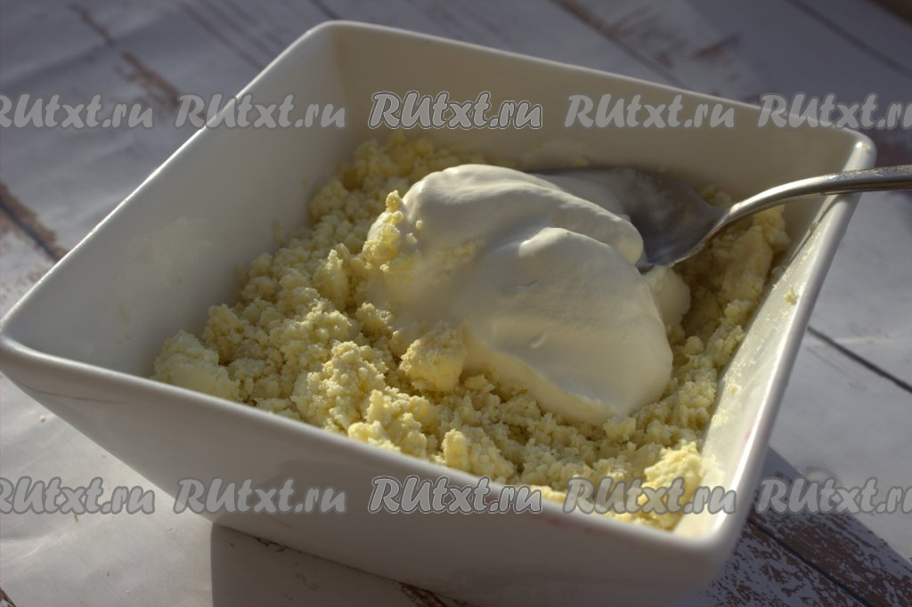 Желтки поместить в миску, добавить сметану и перемешать до однородной массы.