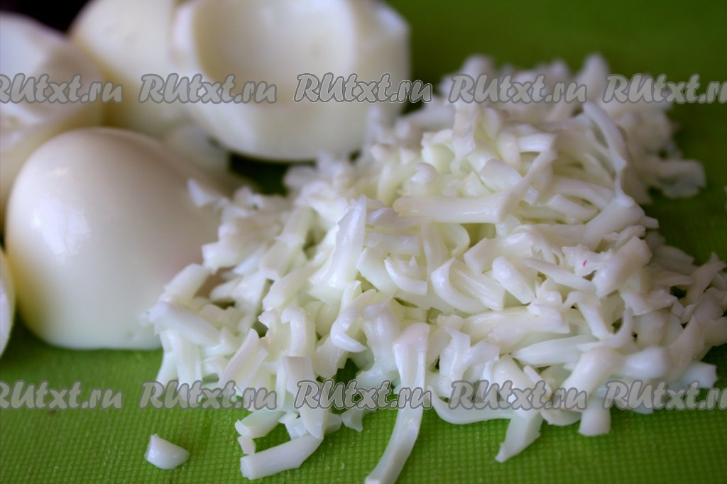Сварить вкрутую яйца (с момента закипания варить 10 минут), затем охладить и очистить. Яйца разделить на желтки и белки. Натереть на крупной тёрке белки.