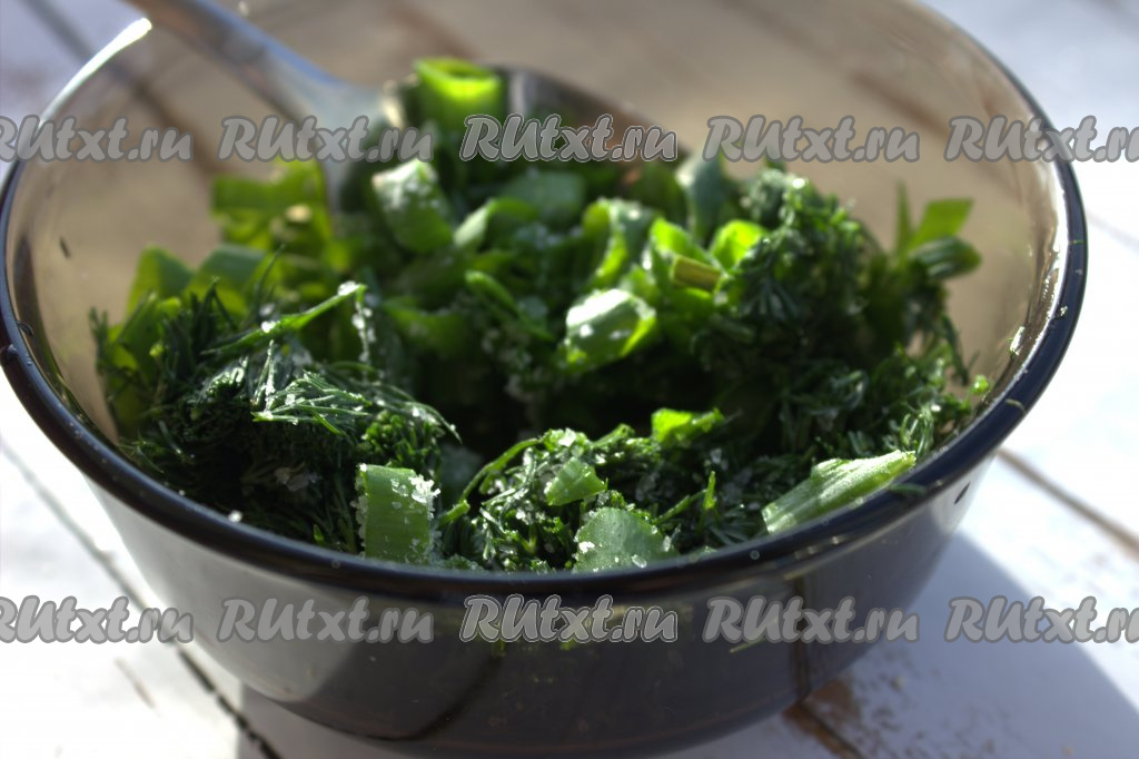 Зелень (у меня укроп и зелёный лук) вымыть, обсушить, измельчить ножом, посолить и при помощи ложки хорошо перемешать, чтобы зелень пустила сок.