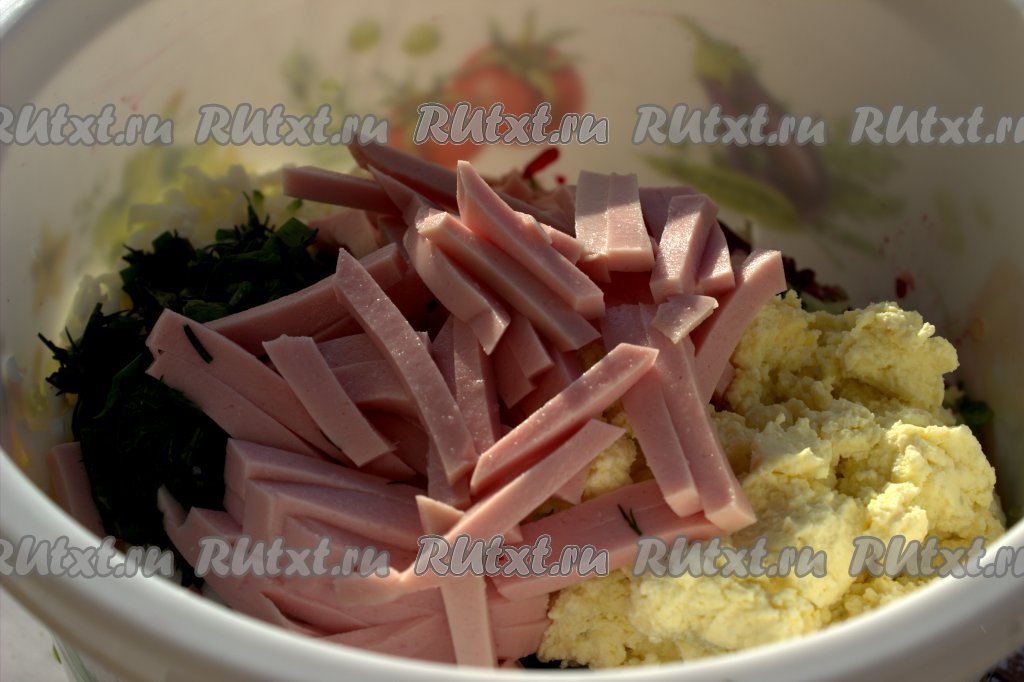 Варёную колбасу нарезать небольшими брусочками и добавить в миску к свекле, огурцам, зелени и яйцам.