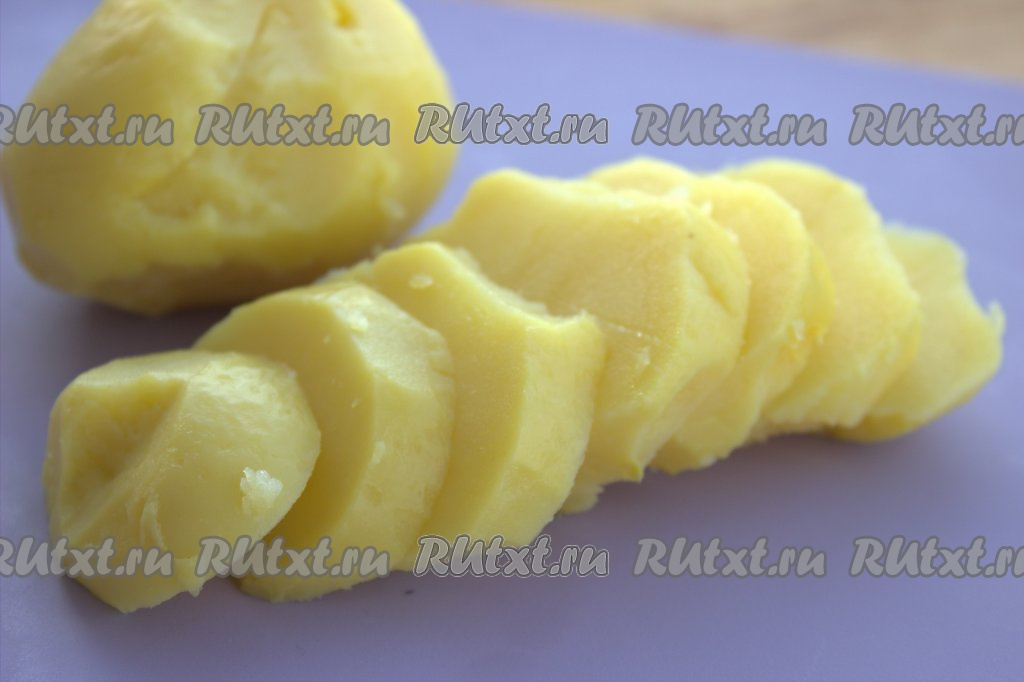 Тем временем отварить картошку в мундире до полной готовности (в течение минут 30 с момента закипания воды), почистить и нарезать кружочками.