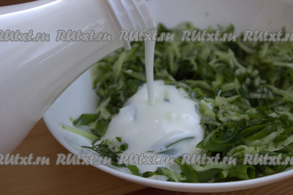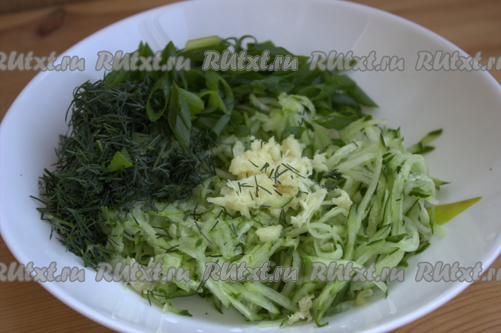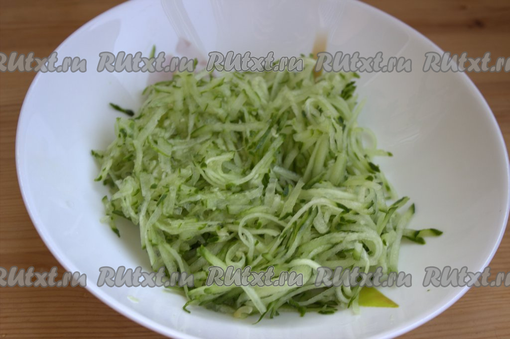 Огурцы помыть, натереть на тёрке среднего размера, выложить в миску, посолить и дать постоять минут 10, чтобы огурчики дали сок.