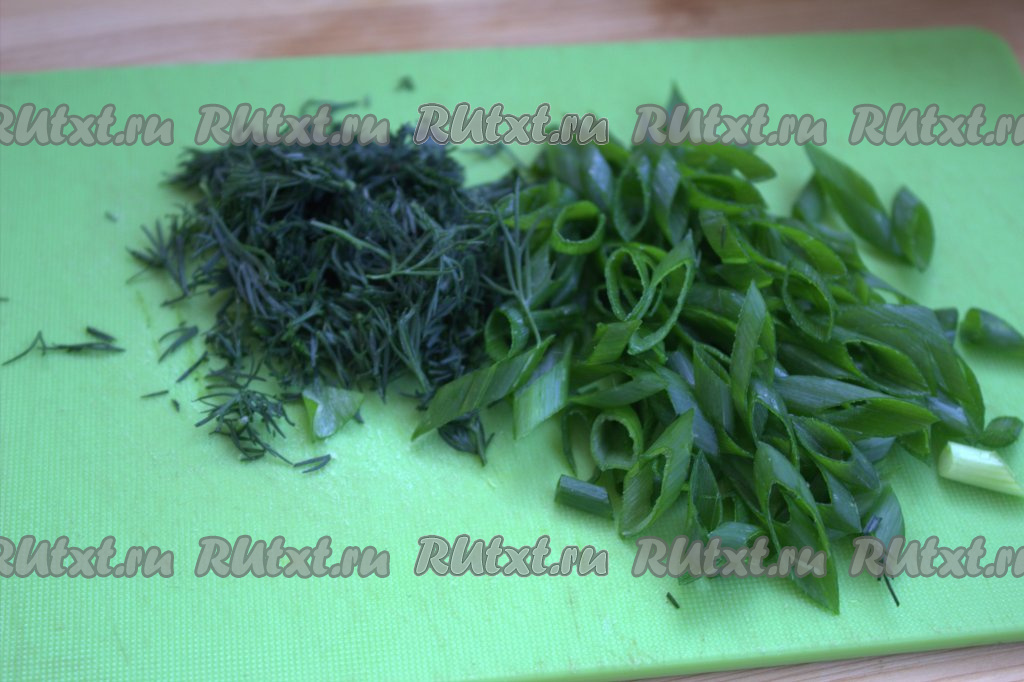 Вымыть и мелко нарезать перья зелёного лука и укроп.