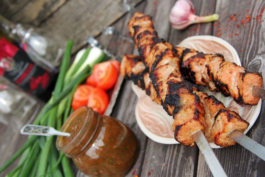 Мы часто готовим шашлык с разнообразными маринадами, из разных видов мяса. Недавно приготовили шашлык из свинины, замаринованной в красном вине с добавлением лука. Мясо получилось вкусным, сочным, ароматным. А благодаря мелко измельчённому луку, входящему в состав маринада, кусочки свинины стали очень нежными. Я мариновала мясо в сухом красном вине в течение 5 часов. Готовый шашлык следует подавать в горячем виде со свежими овощами, любимыми соусами и зеленью.