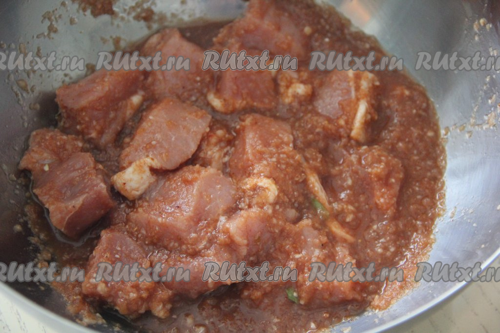 Кусочки свинины тщательно перемешать со специями и луком.