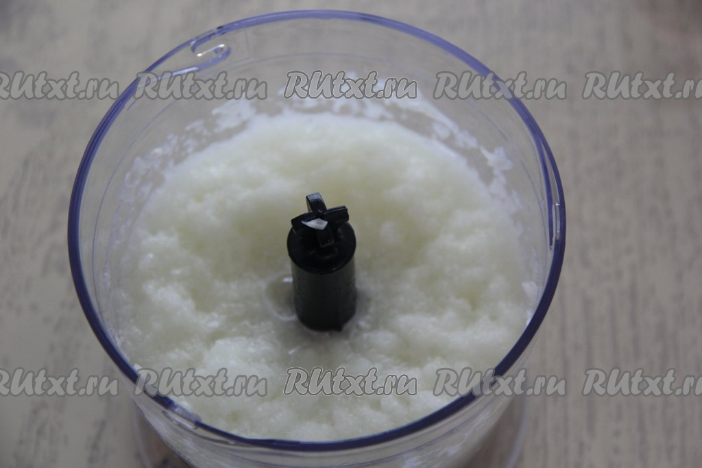 Лук измельчить в блендере до кашицеобразного состояния (или перекрутить через мясорубку).
