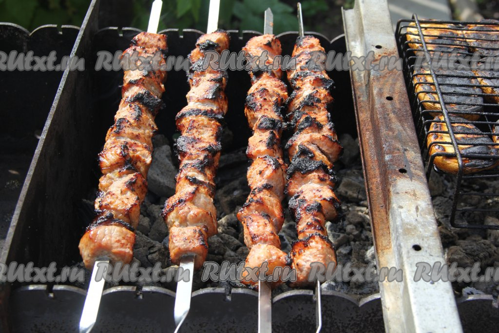 Выложить шампуры с мясом на мангал с раскалёнными углями и жарить шашлык до готовности (при надрезании готового кусочка свинины на срезе не должно быть примесей крови, продолжительность жарки во многом зависит от жара углей и величины нарезки, ориентировочно шашлык готовится от 20 до 35 минут). Жарить мясо следует без прямого огня, периодически переворачивая шампуры.