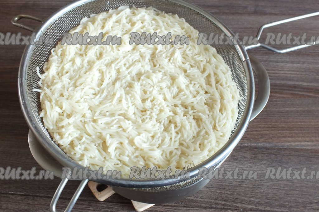 Откиньте вермишель на дуршлаг, оставьте на время, чтобы стекла вода.