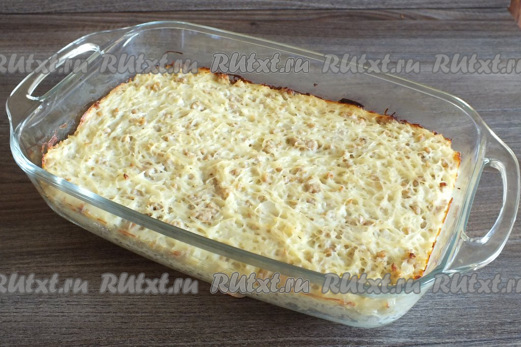 По истечении времени запеканка должна покрыться лёгкой корочкой. Достаньте её из духовки и сразу же сервируйте на стол.