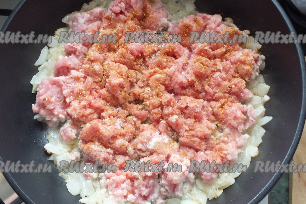 Добавьте в сковороду мясной фарш, соль, специи для мяса, перемешайте.