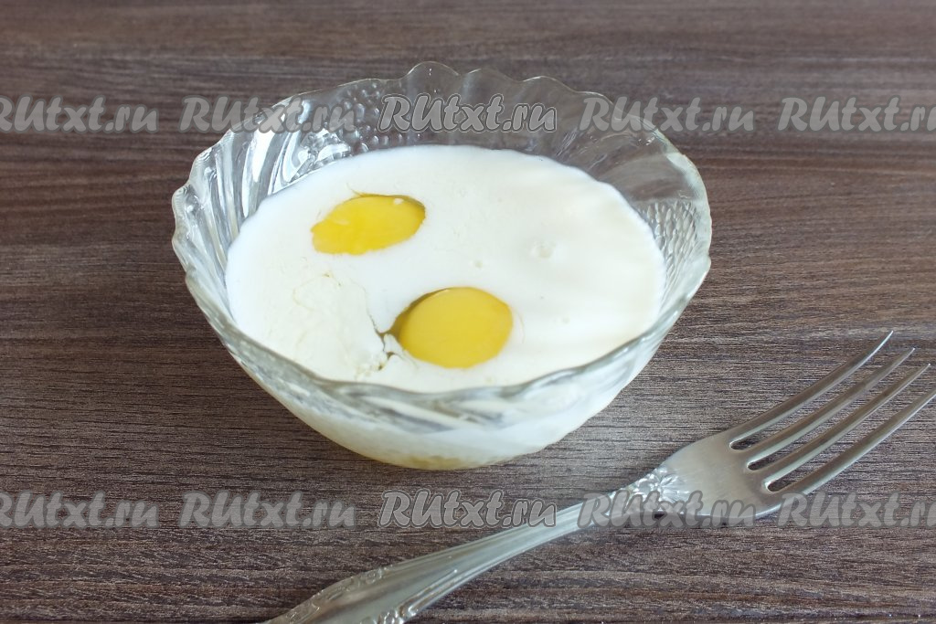 В мисочке взбейте вилкой 2 яйца и молоко.