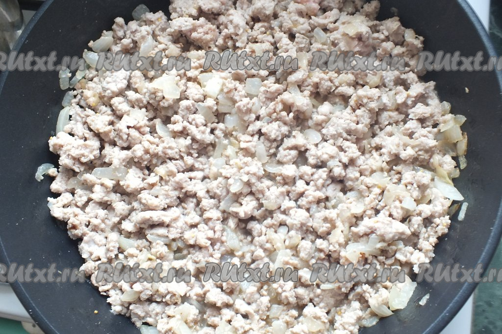 Обжаривайте фарш с луком до побеления мяса и выделения сока, перемешивая и разбивая комочки фарша. Обжаривайте не более 8 минут. Важно, чтобы мясной сок сохранился. Снимите сковороду с огня.