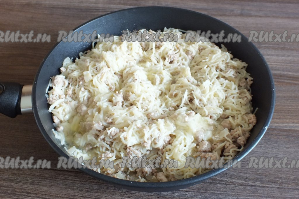 Затем добавьте отваренную вермишель к обжаренному фаршу с луком, перемешайте. Если необходимо, то подсолите.
