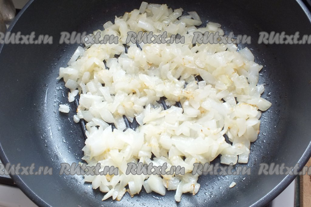 В сковороде разогрейте растительное масло, переложите в неё нарезанный лук и обжаривайте его до мягкости на среднем огне (около 5-6 минут), периодически помешивая.