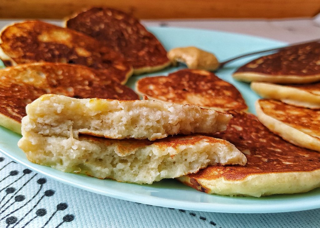 Банановые оладьи, приготовленные на кефире с рисовой мукой, подавать горячими со сметаной. Такие оладушки очень удачно сочетаются с арахисовой пастой.