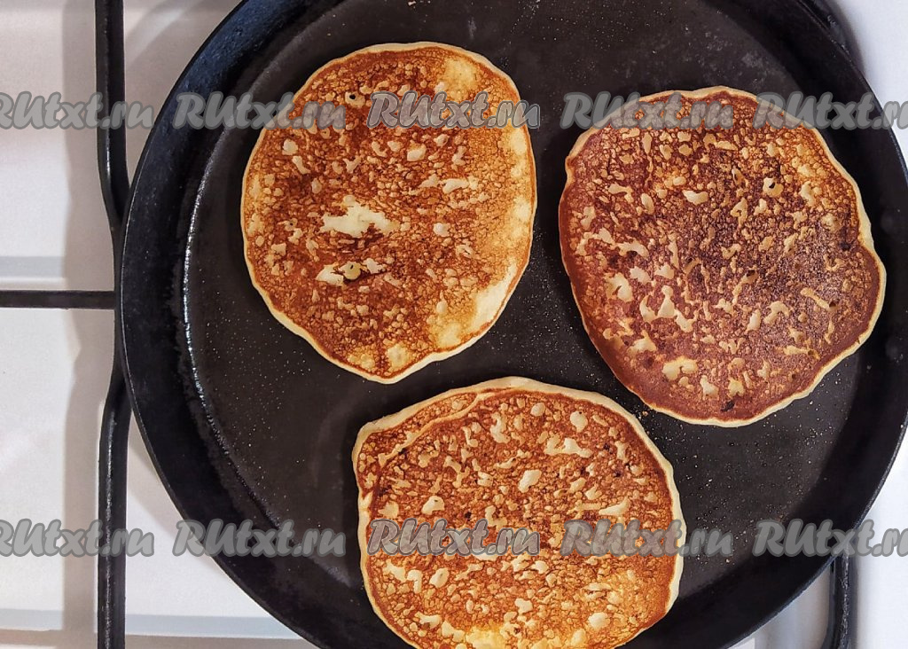 Выпекать банановые оладьи на медленном огне под закрытой крышкой по 2 минуты с каждой стороны (до золотистого цвета), затем переложить на тарелку. Аналогично пожарить все оладушки.