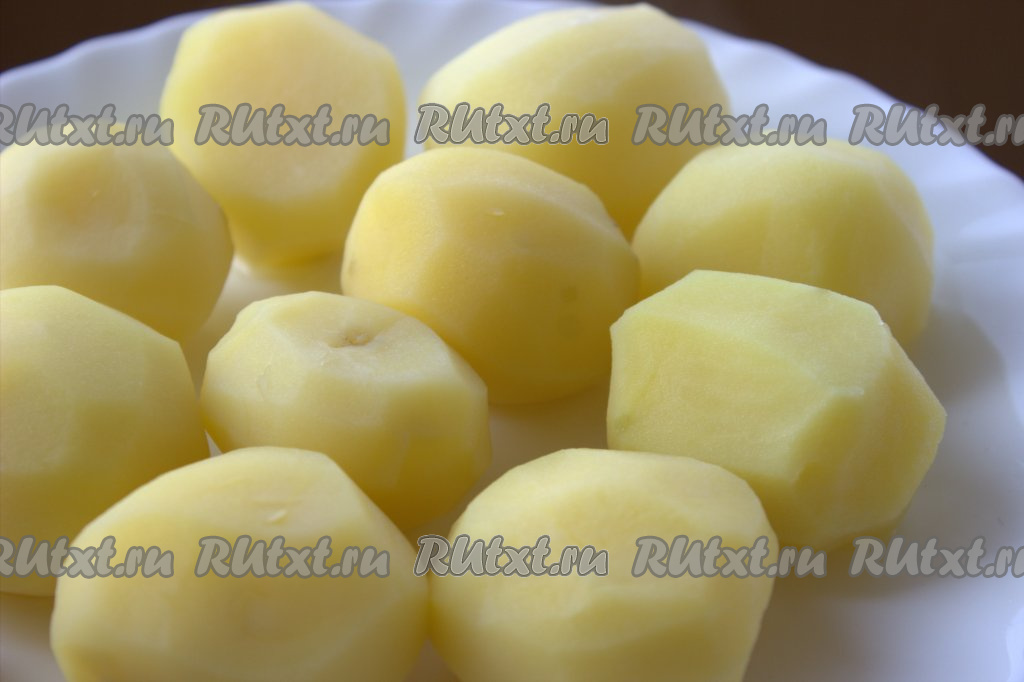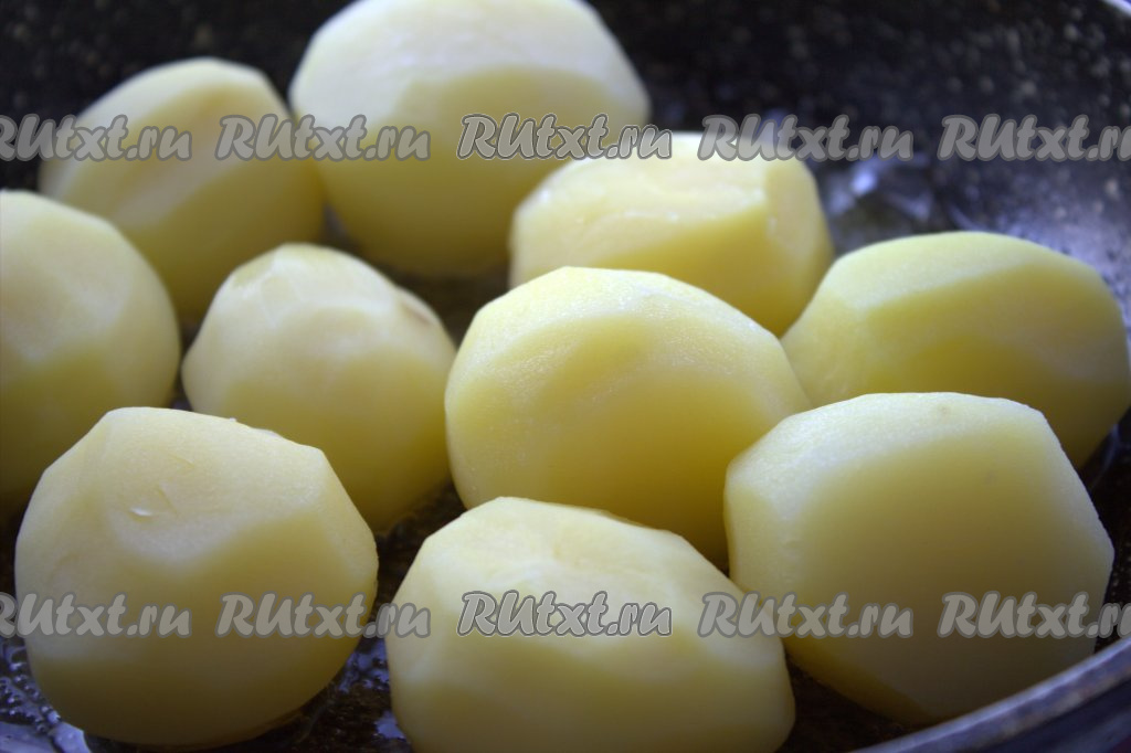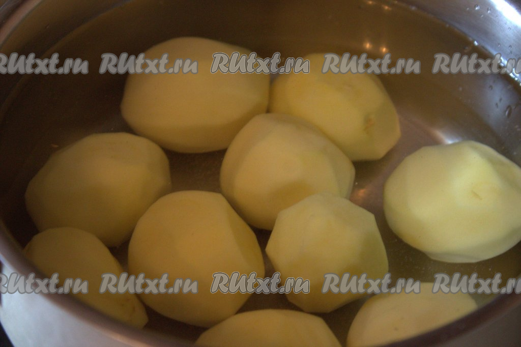 Картофелины среднего размера вымыть, очистить от кожуры. Старайтесь чистить так, чтобы картошка приобрела форму "бочонка". В кастрюлю с очищенной картошкой влить воду, поставить на огонь и слегка посолить. Варить клубни до полуготовности (с момента закипания воды варить минут 7). Продолжительность варки во многом зависит от сорта картофеля. Отваренная картошка должна хорошо держать форму, но не развалиться.