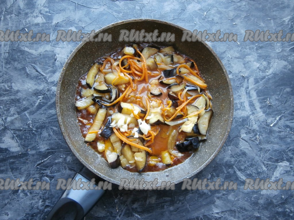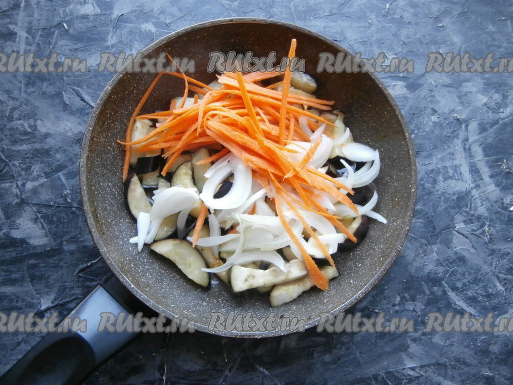 Баклажаны чуть отжать от жидкости, выложить на сковороду, достаточно хорошо разогретую с растительным маслом, и обжарить минут 5 на среднем огне. Затем добавить нарезанный перьями (или полукольцами) лук, выложить морковь, натёртую на корейской тёрке.