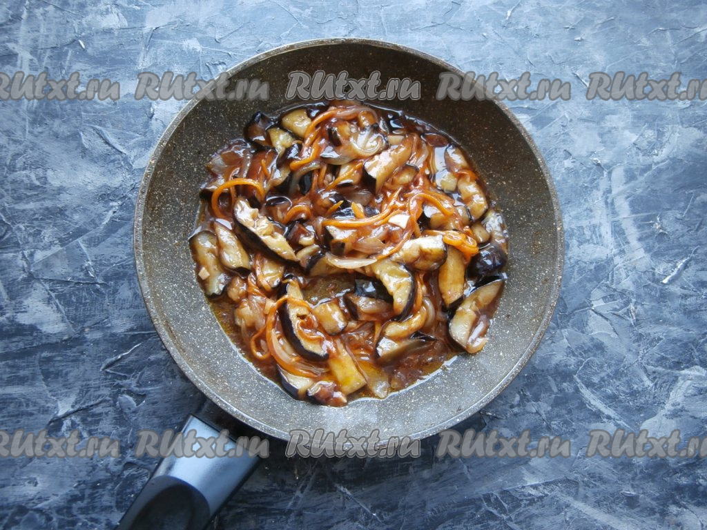 На небольшом огне протушить баклажаны, постоянно их перемешивая, ещё 3-4 минуты. Соус загустеет и баклажаны приобретут красивый зеркальный цвет.