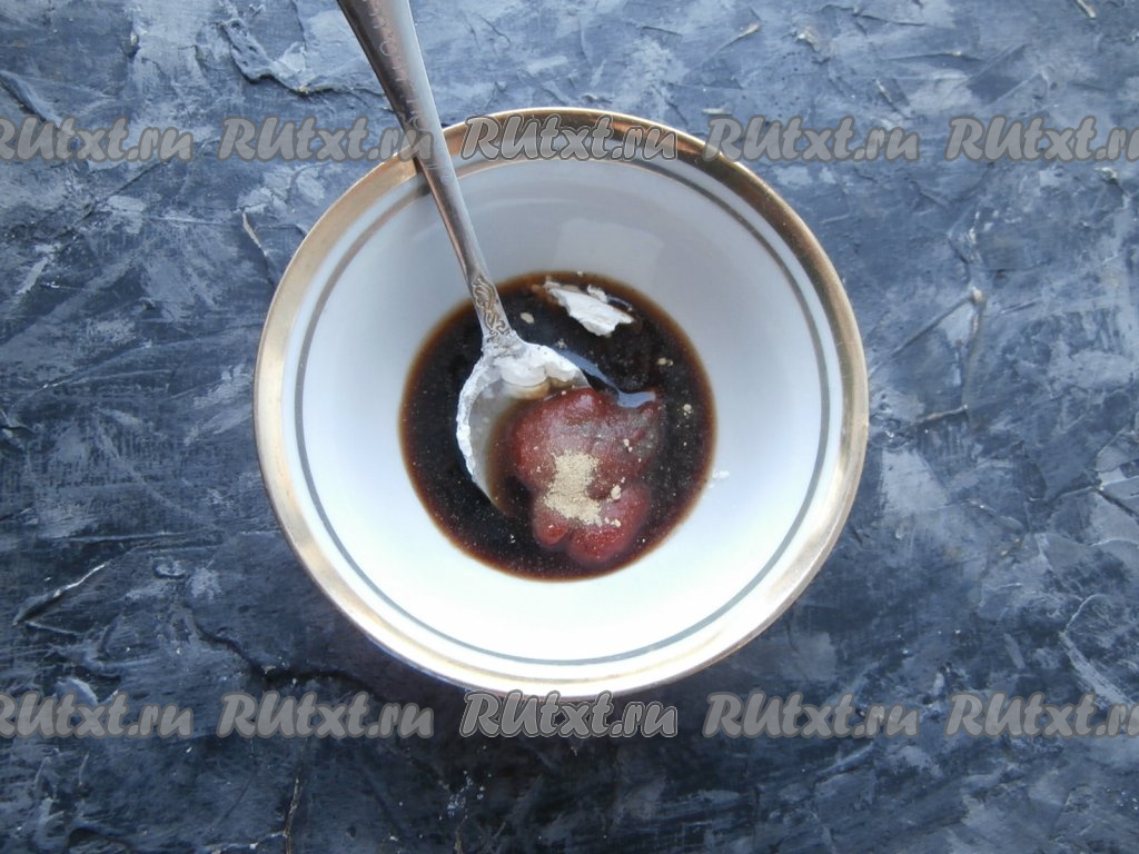 К соевому соусу добавить томатную пасту, сушёный имбирь, крахмал, сахар и влить уксус.