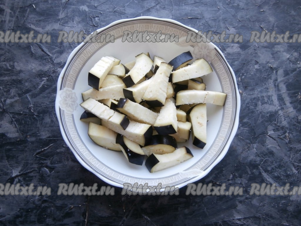 Баклажан помыть, обсушить и нарезать крупными брусочками, посолить и оставить на 15 минут. Лук, чеснок и морковь очистить.