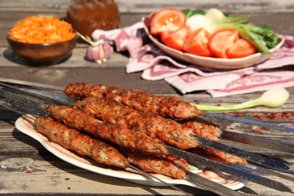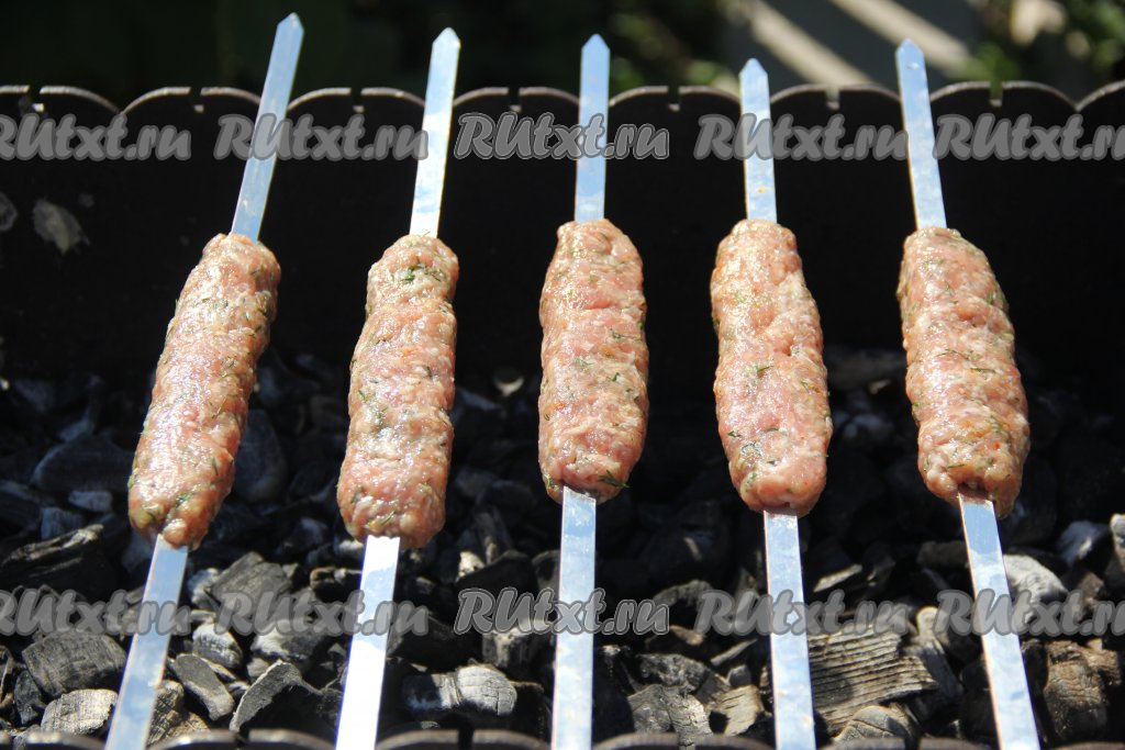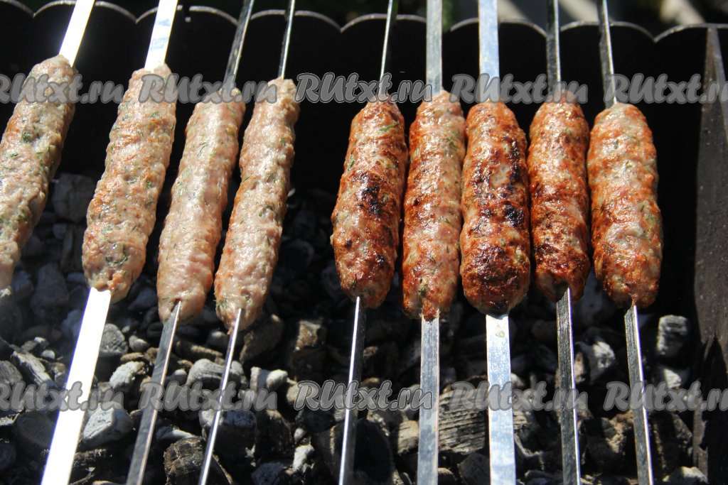 Жарить на седых углях без прямого огня, используя только жар углей мангала, до золотистого цвета, часто переворачивая люля-кебабы, чтобы они равномерно прожарились.