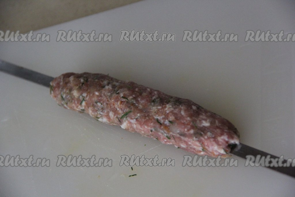 Готовый холодный фарш разделить на части, примерно, по 90 грамм. Насадить каждую часть фарша на шампур и равномерно распределить, сформировав длинный люля-кебаб (как на фото). Руки лучше смочить холодной водой, чтобы фарш не прилипал к рукам.