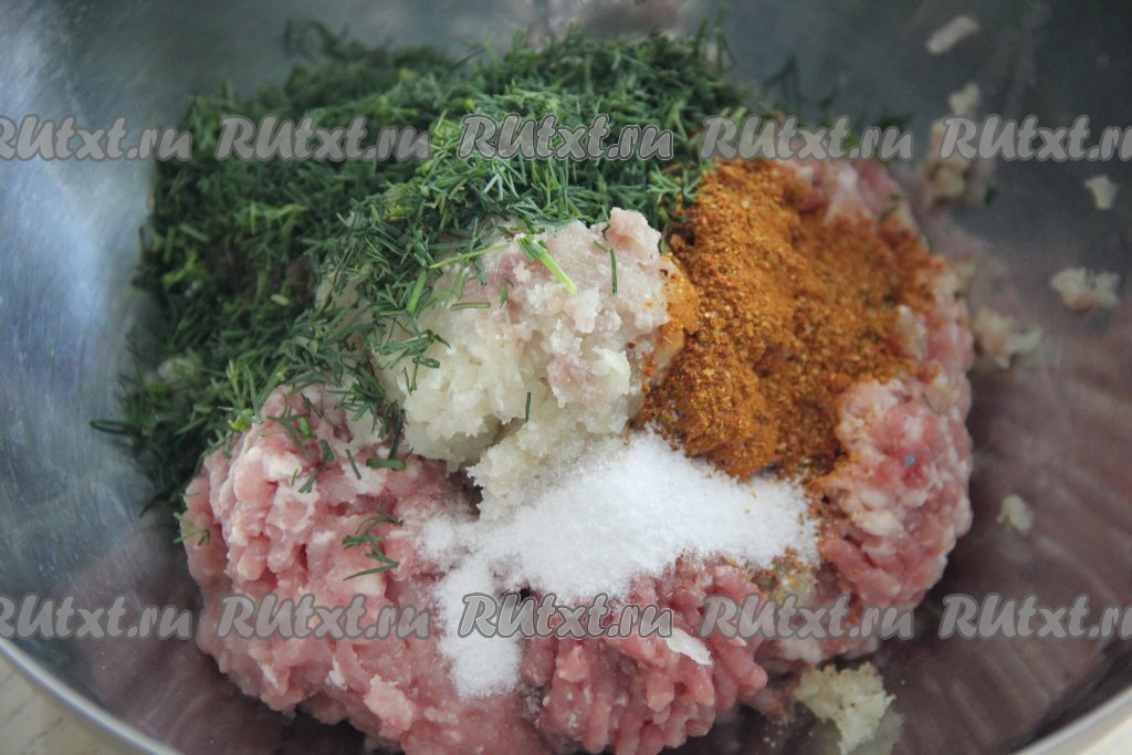 Лук поместить в марлю и отжать лишний сок. Отжатую мякоть лука соединить с мясным фаршем, чесноком, добавить соль, специи и укроп.