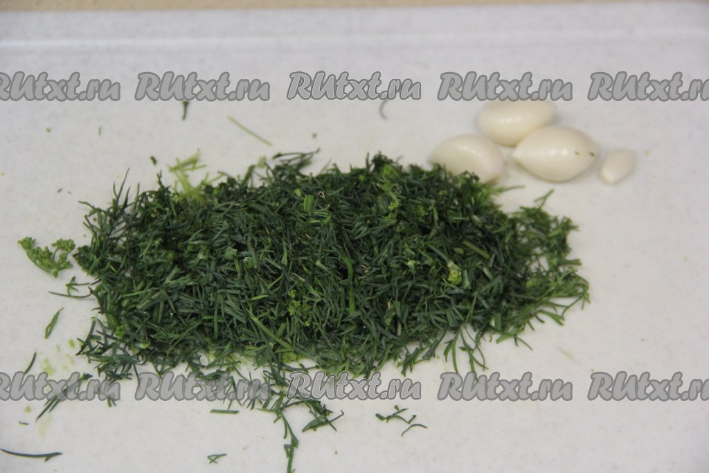 Вымыть, обсушить и мелко нарезать укроп. Пропустить через пресс очищенные зубчики чеснока.