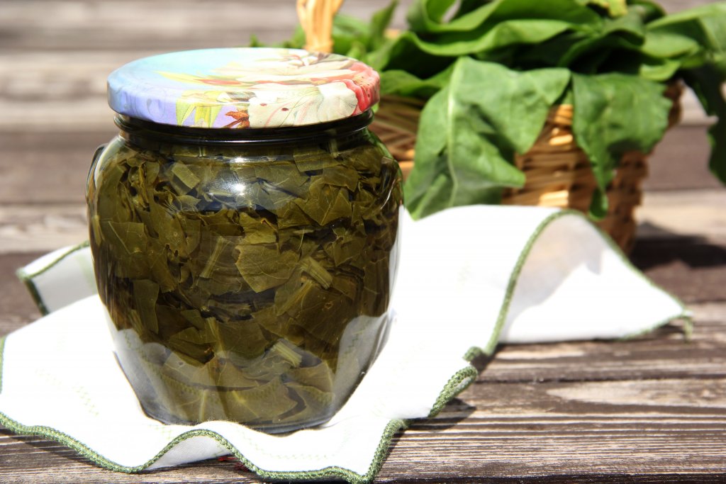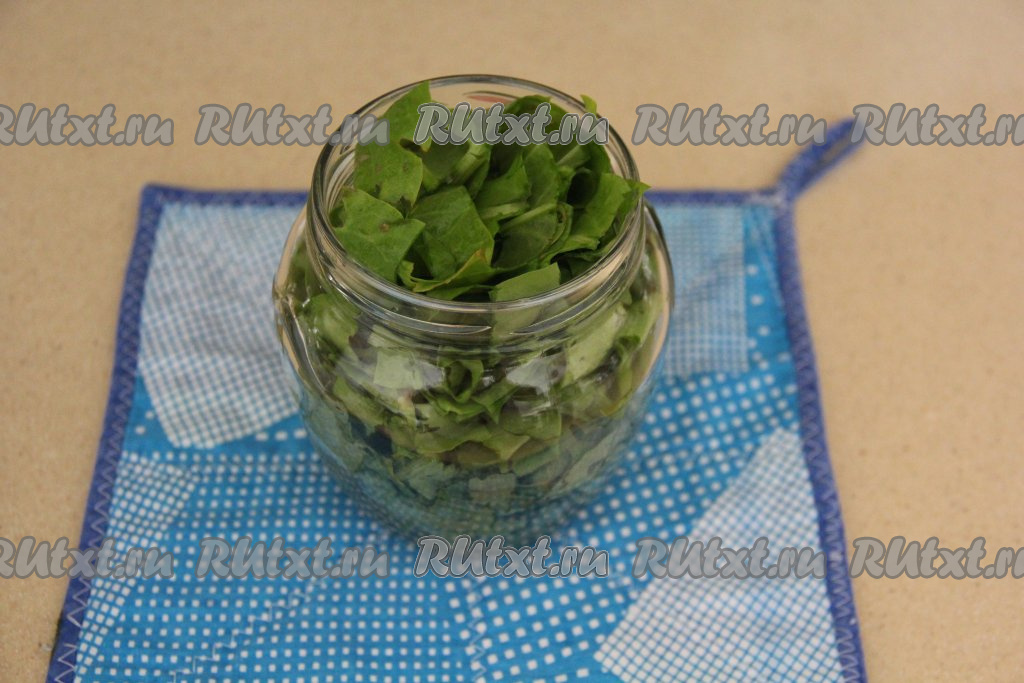 Выложить щавель в банку и слегка утрамбовать его, заполняя баночку до самого верха.