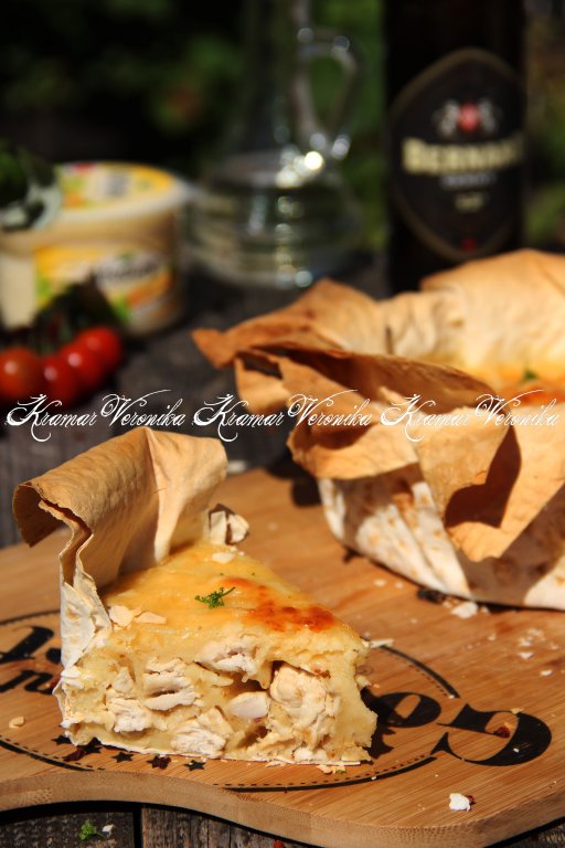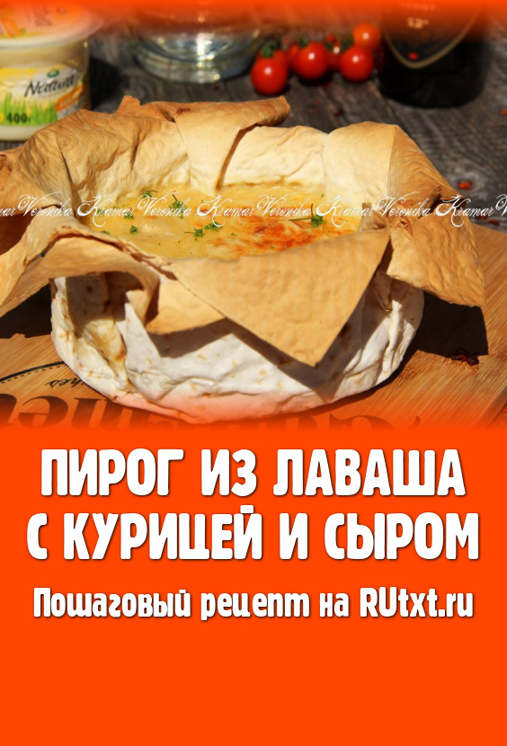 Поставить пирог из лаваша с курицей и сыром минут на 30 в духовку, разогретую до 200 градусов. Готовую выпечку немного остудить, а затем нарезать на кусочки и подать к столу.