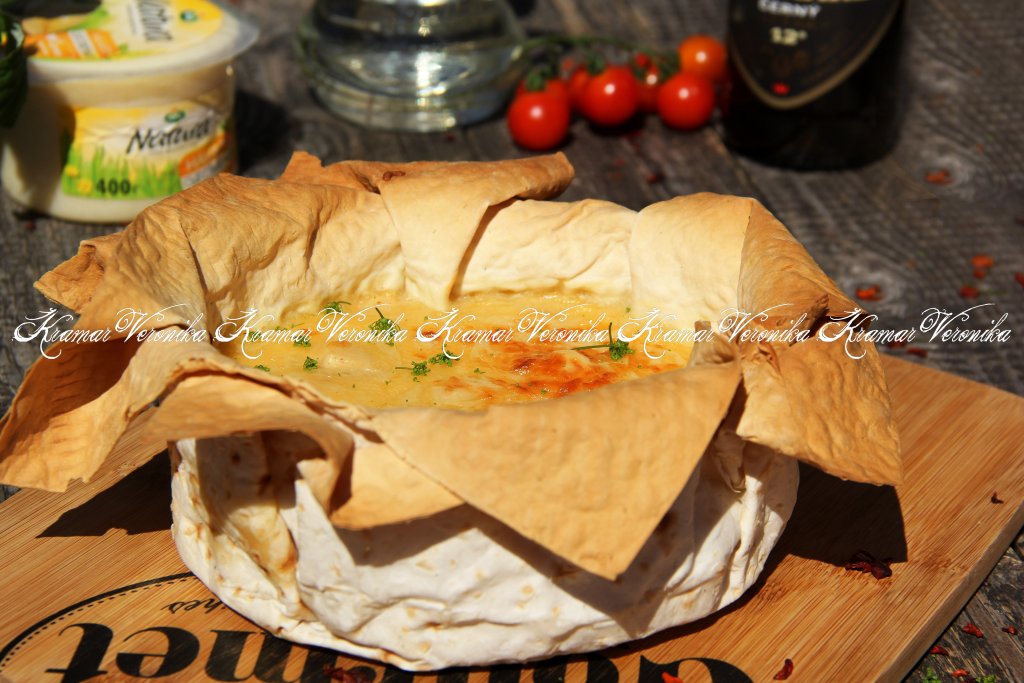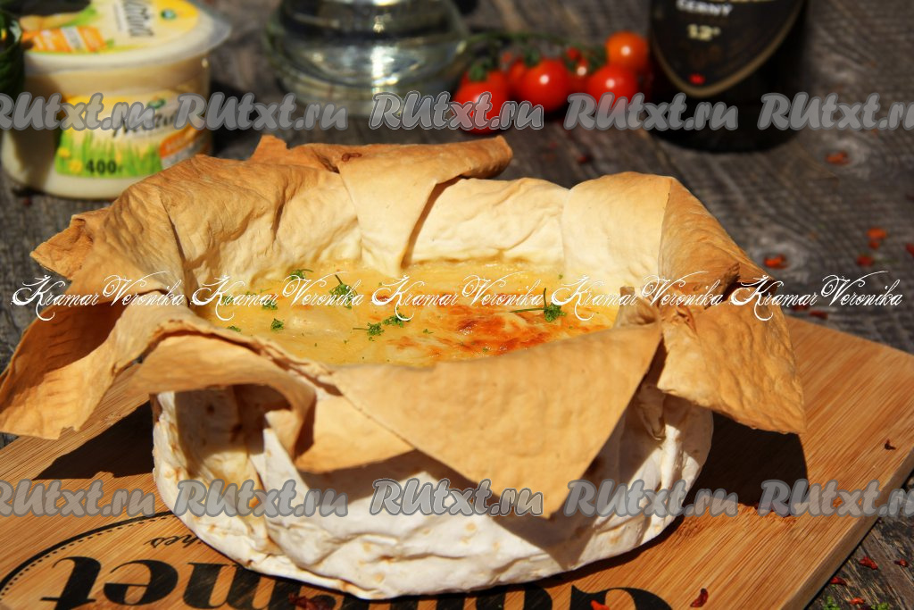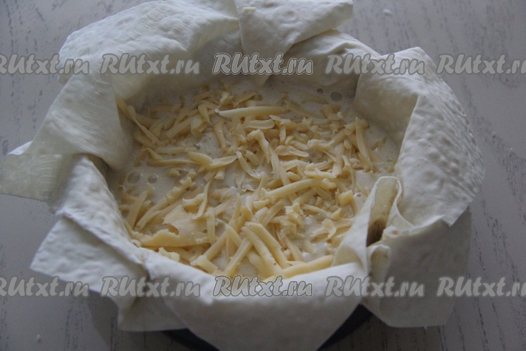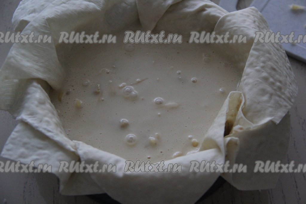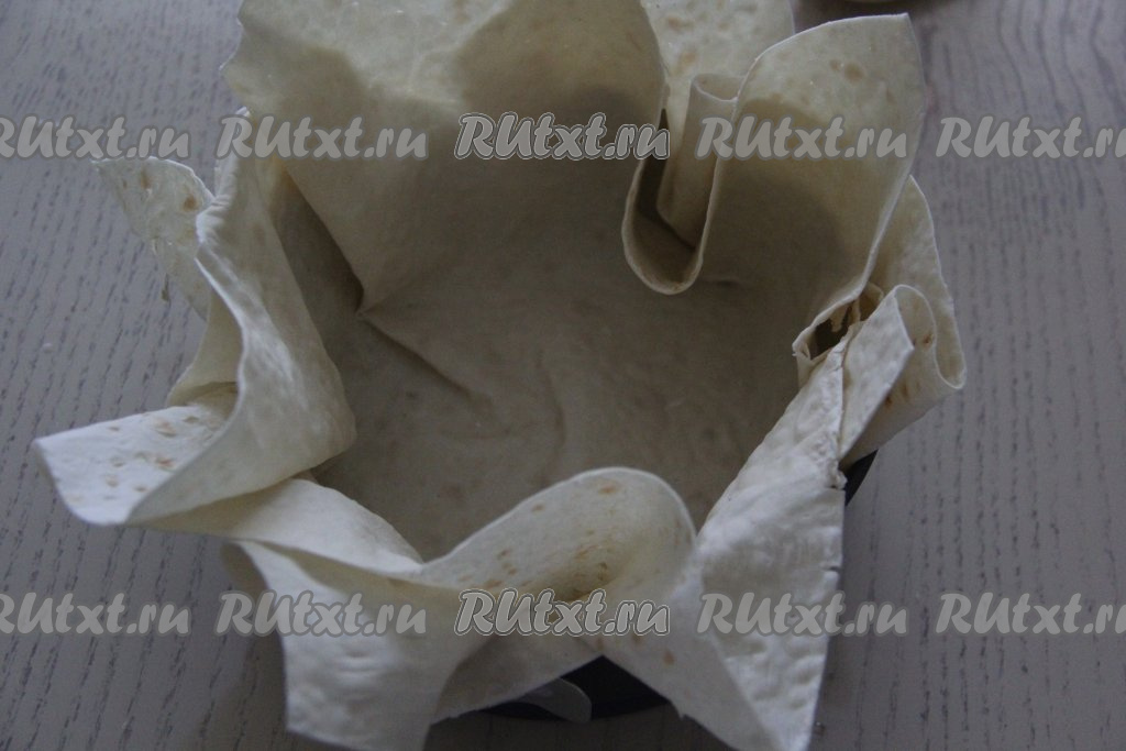 Разъёмную форму (у меня форма диаметром 24 см) выстелить лавашом. Для этого из лаваша вырезать 2 квадрата и выстелить ими форму, края лаваша должны свисать.